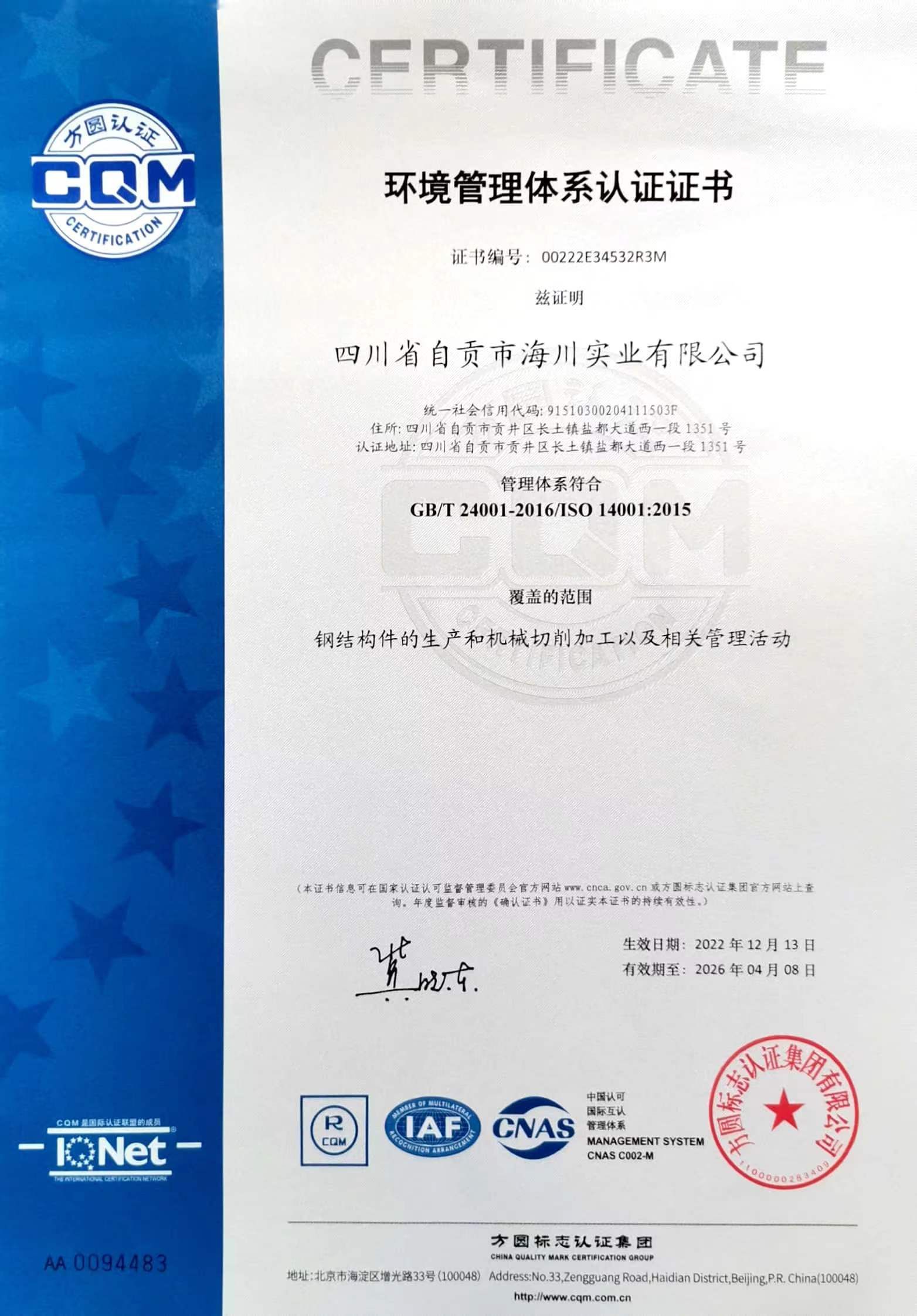 環(huán)境管理體系認證證書(中文版)